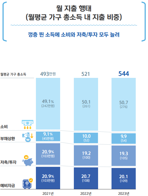 신한은행이 본 보통사람이면 월급의 절반은 생활비로 쓰고, 10%는 빚을 갚고, 20%는 저축을 한다고 하는데, 우리의 대출이자가 50만원 수준인가요? 아파트대출 3억이면 최소 월 120만원인데, 영끌열풍 이후 급여의 절반을 빚을 갚는 사람이 더 많을지 몰라요. 그래서, 빚대신에 거주 비용으로 월 120만원을 쓴다고 가정하겠습니다.