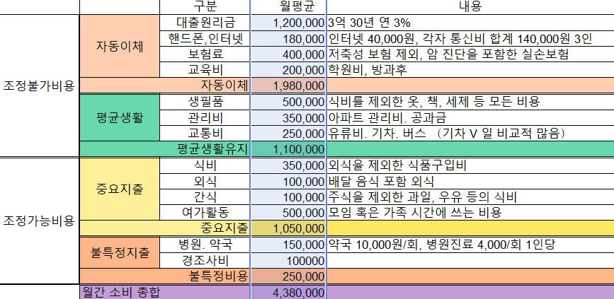 하지만, 세 식구 매 끼니 풍요롭게 먹는 게 아니라도 치킨이 배달비까지 삼만원인 시절에 한 끼 2만원도 안 되는 식비는 너무 각박한 것 같아요. 더구나 연봉 7천인데 차 없이 10만원의 교통비는 뭔가 현실적이지 않아 보입니다. 심지어 아이의 학원비가 28만원이 나가는데 의류 13만원이면 3식구 중 한 사람만 옷을 사는 건가 싶지만, 다양한 가구의 평균치라고 이해하고 생활비는 표 보다 조금 높은 300만원으로 하겠습니다.