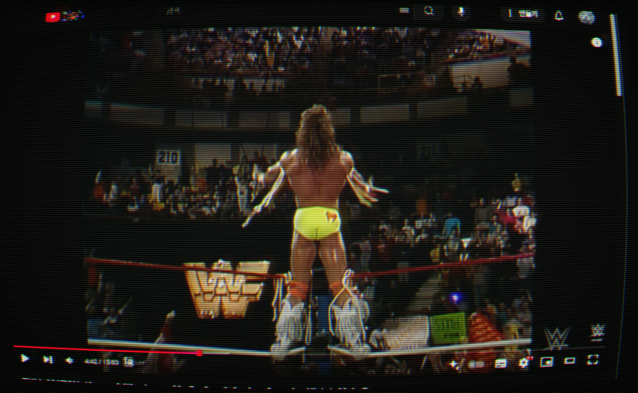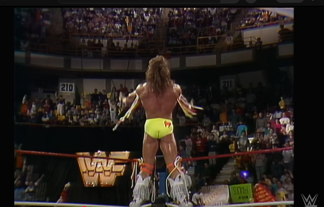 WWF 1990년 7월 27일 워리어가 로프에 올라 포효하는 모습입니다.
