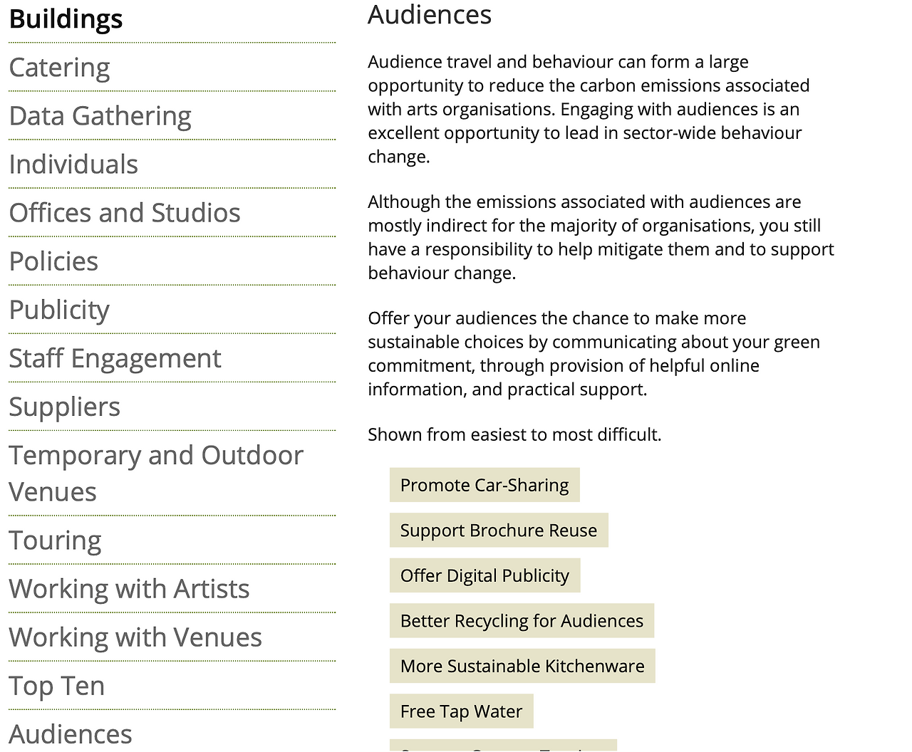 자, 이 정도 나열했습니다. 겨우 그거냐고요? 아직까지 저 정도 실천으로는 하드코어 *그리너가 아닌 것 같다면, 저 위의 리스트보다 더 많은 것을 실천하고 싶다면. 그래서 준비했지요. 소스는 스코틀랜드의 Creative Carbon Scotland*라는 그룹의 Green Arts Portal(예술과 지속가능성 관련 참고할 수 있는 툴킷을 모아놓은 곳)이라는 곳에서 가져왔습니다. 영문으로 된 자료라 하나하나 번역할 수는 없었지만(언젠가 번역하여 올리겠습니다), 우선 요약된 정보라도 공유할까 합니다.