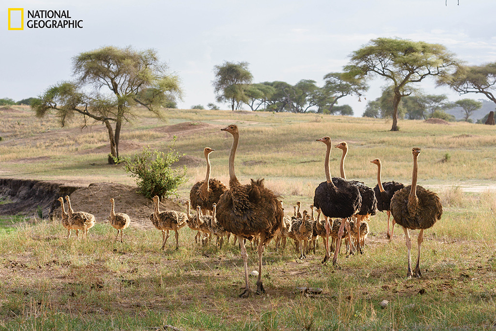 탄자니아 타랑기레 국립공원에서 암컷 타조 세 마리와 수컷 타조 세 마리, 새끼 타조 42마리가 포식자들이 나타날까 봐 경계를 늦추지 않고 있다.
