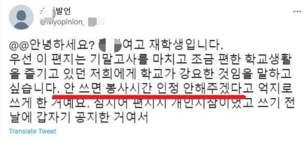 실제 이 학생은 1월 초 자신의 SNS에 군 생활을 비하하는 듯한 글을 올린 적이 있어 학교의 봉사활동에 대한 강제에 반발해서 이런 편지를 썼다기보다는 ‘평소 생각대로 군 장병을 조롱한 것 아니냐’는 지적도 높습니다.