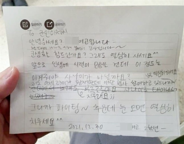 일단 필자가 보기에는 그런 거지같은 편지를 쓴 학생에게도 책임이 있어 보입니다. 그런 편지를 받은 장병은 심정이 어떻겠습니까?