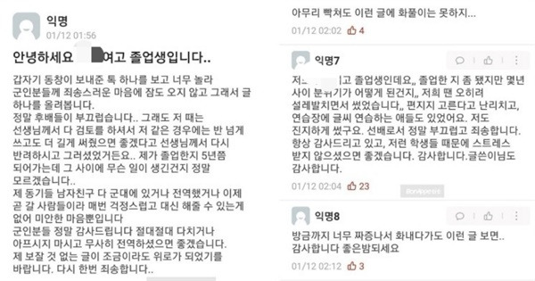 이 학교 졸업생들도 “정말 후배들이 부끄럽다, 선배로서 정말 부끄럽고 죄송하다”며 “절대 다치거나 아프시지 마시고 무사히 전역하셨으면 좋겠습니다”라는 참담한 마음을 표하고 있는 지경입니다.