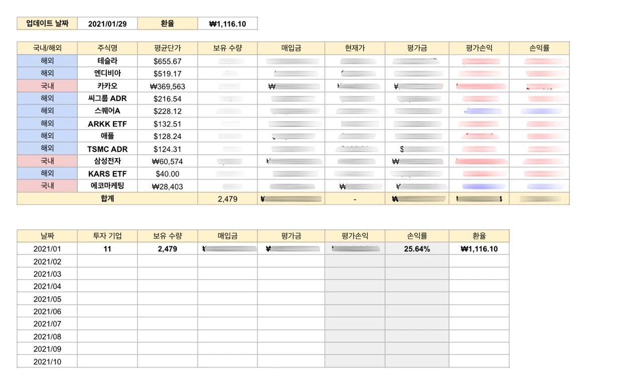 나는 주식을 자주 보고 상승 곡선 보는 것을 좋아하고, 기록하는 것을 좋아하는 사람이다. 그래서 주식 주문서를 엑셀에 만들어 놓고 주식 투자할 때마다 전문투자자(?)처럼 주문서를 만들고 매월 1-2번 정도 현재가를 기록하며 얼마나 수익이 났는지 체크하곤 한다.