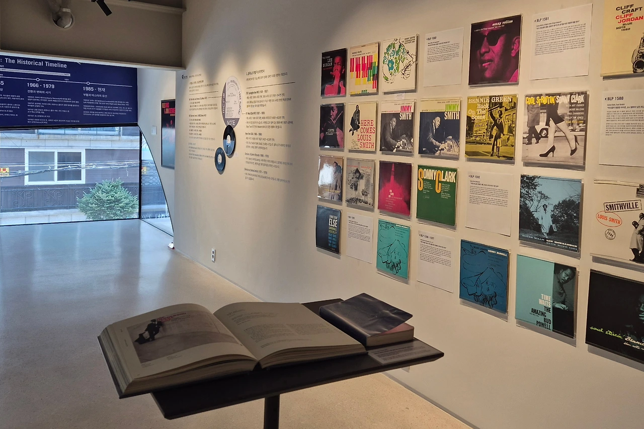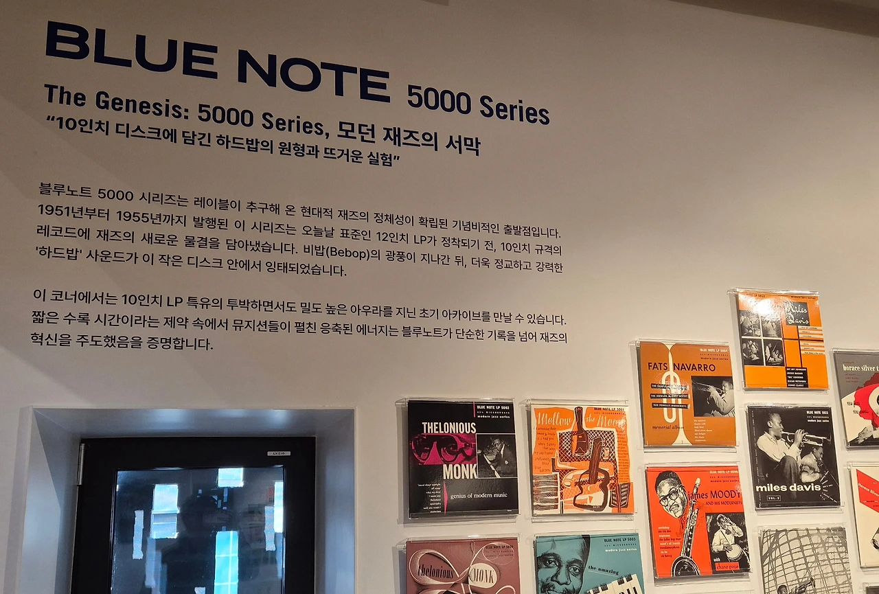 FEZH의 전시 <블루노트가 없다면 재즈는 없다It Don't Mean Jazz>를 감상하고 왔다. 블루노트BLUE NOTE는 1939년 뉴욕 독일의 압제를 피해 건너온 유대인 알프레드 아이언Alfred Lion과 프랜시스 울프Francis Wolff가 엔지니어 루디 반 겔더Rudy Van Gelder를 만나 설립된 재즈 음반사이다. 전시의 특징은 숫자 '445'로 루디 반 겔더의 스튜디오 주소지이자 LP 컬렉션의 총수량이 445장이 전시되어 있다. 루디 반 겔더가 24비트로 디지털 리마스터링하여 남긴 200여 장의 RVG 에디션, 10인치 규격의 5000시리즈부터 황금기인 1500 시리즈 99장 전권(1955~1958), 하드밥이 대중적으로 완성되고 프리 재즈가 태동한 4000 시리즈(1958~1970)까지 블루노트가 여태껏 선보인 재즈음악의 DNA를 연대기적으로 구성하였다. 인상적이었던 것은, 블루노트 카탈로그 코드 및 주소 연대기를 읽는 법(카탈로그 프리픽스 및 일련번호 체계, 라벨 주소의 변천사 등)이 친절하게 설명되어 있다는 점이다. 지하 1층에는 하루키스트 뮤직 라이브러리와 재즈펍이 마련되어 있는 것은 물론 LP레코드가 어떻게 만들어지는지 제작 과정을 4층 물의집CASA DEL AUGA에서 상영하고 있다.