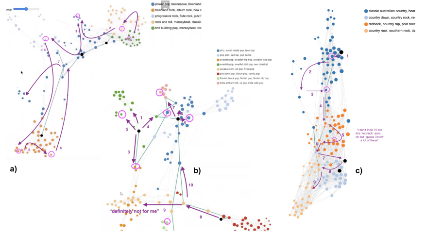 스포티파이는 단순히 선형 인터페이스가 아닌 자아실현의 도구로 일조할 수 있기 위한 에이전트 시스템으로 음악을 추천할 수 있도록 하고 있다.「TastePaths: Enabling Deeper Exploration and Understanding of Personal Preferences in Recommender Systems」를 살펴보면 HCI/UX를 개발하는 과정이 상세히 나타나 있다. 연구진들은 RQ를 개인화와 탐색, 학습으로 잡고 전문 음악 큐레이터 5명을 섭외해 두 개의 장르를 15분 동안 탐색하게 하였다. 하나는 자유이고 하나는 RateYourMusic에 있는 인기장르목록에 대해 발언을 했는데 이들에게서 나온 공통 패턴이 1) 앵커링, 2) 조감도 확보, 3) 디깅이이었다. 첫 번째는 Anchor artists로 나에게 친숙한 아티스트의 음악을 통해서 다른 아티스트를 발굴하게 된다는 친숙함에 관한 것이다. 두 번째는 특정 아티스트 이전에 이와 유사한 장르나 하위 장르 등 사전 정보를 파악하여 맥락화하게 된다는 것이다. 마지막은 흥미로운 아티스트를 발굴하면 인기 있는 트랙을 들으면서 청취를 할지 말지 결정하게 된다는 이야기였다. 이를 기반으로 새로 개발한 모델 중 하나는 TastePaths로, (D1)3명의 아티스트로 시작해서 (D2) 150명의 아티스트 노드를 Louvain 알고리즘으로 클러스팅하여 하위 장르 3개를 라벨링하는데, TF-IDF 기법으로 중요도를 계산하여 붙인 다음 (D3) 노드를 클릭하면 아티스트의 인기 있는 곡이 나오고 미리 듣기가 지원되는 형식이다. 따라서 앵커에서 핵심 클러스터 아티스트로 이동하기 위한 최적 경로를 구하기 위해 Steiner tree 알고리즘를 이용하고 핵심이자 경계에 있는 게이트웨이 아티스트를 반드시 지나가도록 설계했다.