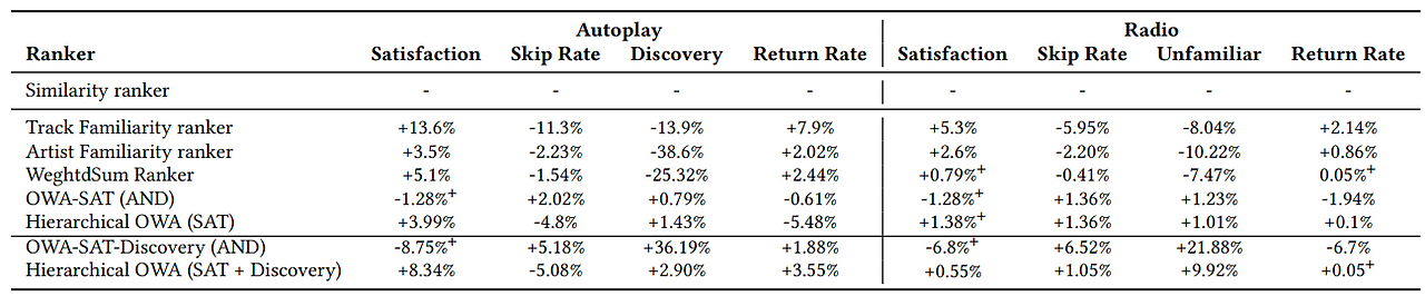 Hierarchical OWA 방식은 다음과 같다. 먼저 word2 vec 임베딩을 하여 트랙을 벡터 공간에 위치시킨 다음, 관련성, 친숙성, 발견 세 가지 항목을 중심으로 값을 계산한다. 관련성 값은 γ(r) = (1 / (α + r))^(1/3) -> 유사도 점수 세제곱근의 역수이며, 친숙성 값은 pi=c1⋅c2+c3 (c1: 재생 맥락 의도 c2: 스트림 시작 이유 c3: 스킵, 음수 패널티)로 나타내는데 이후 시그모이드로 정규화하여 아티스트 선호도 중 n=3인 값을 구한다. 여기서 3인 이유는 가장 선호하는 곡을 들었다고 해서, 그 아티스트를 좋아하지 않을 수 있기 때문에 히트 트랙이라는 변수를 최대한 줄이기 위함으로 설명하고 있다. 마지막인 발견값은 dS(u, t)=1 [d] ×ζ(u, t) -> 발견 유무 1 [d] x사용자-트랙 유사도로 측정했다. 당연하지만 해당 세 가지 요인을 병렬-상관관계 분석을 했을 때 유사성 <->트랙 친숙성, 유사성 <->아티스트 친숙성 간에는 연관관계가 양(+)으로 나타났다. 또한 취향 적합도, 트랙 친숙도, 아티스트 친숙도 보완하기 위해 rank score를 넣었으며, 마찬가지로 역수로 변환해 상대적으로 괜찮은 순위 점수를 반영하였다. 수식은 어려우니 넘어가고 그다음 2단계로 OWA(집계 함수)에 따라 가중치를 순서대로 부여한다. 근데 Hierarchical OWA 방식은 관련성, 친숙성, 발견을 조합한 후 다시 트랙 친숙도와 조합하였으며, 1단계에서 연산으로 하나라도 높으면 되는 OR 논리를 적용하고 다음 조합할 때는 친숙성을 엄격하게 거르는 식으로 유연하게 논리를 적용하였다.