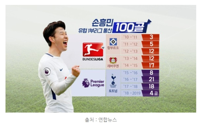 잉글랜드 프리미어리그(EPL) 토트넘의 손흥민이 아시아 최초 득점 왕에 이어 이번에는 아시아 최초로 통산 100골의 위업을 달성했다. 그는 뛰어난 실력은 물론 꾸준한 선수로 알려져 있다. 넣은 골을 보면 페널티킥, 프리킥은 각 1골 외에는 필드골이었다.