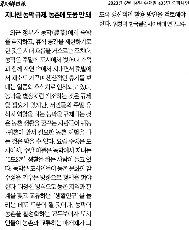정부는 농촌인구 감소에 따라 '정주인구'가 아니라 다양한 방식으로 지역과 관계를 맺고 교류하는 인구를 뜻하는 관계인구나 생활인구를 늘리는데 많은 노력을 기울이고 있다. 농지 구입 규제로 농촌이 어렵고, 지나친 농막 규제는 농촌을 더욱 고립시킬 수 있다. 합리적인 방법으로 농막이 농촌을 활성화시키는 교두보로, 도시민들이 농촌과 교류하는 매개체가 되도록 생산적인 활용 방안을 기대해 본다.
