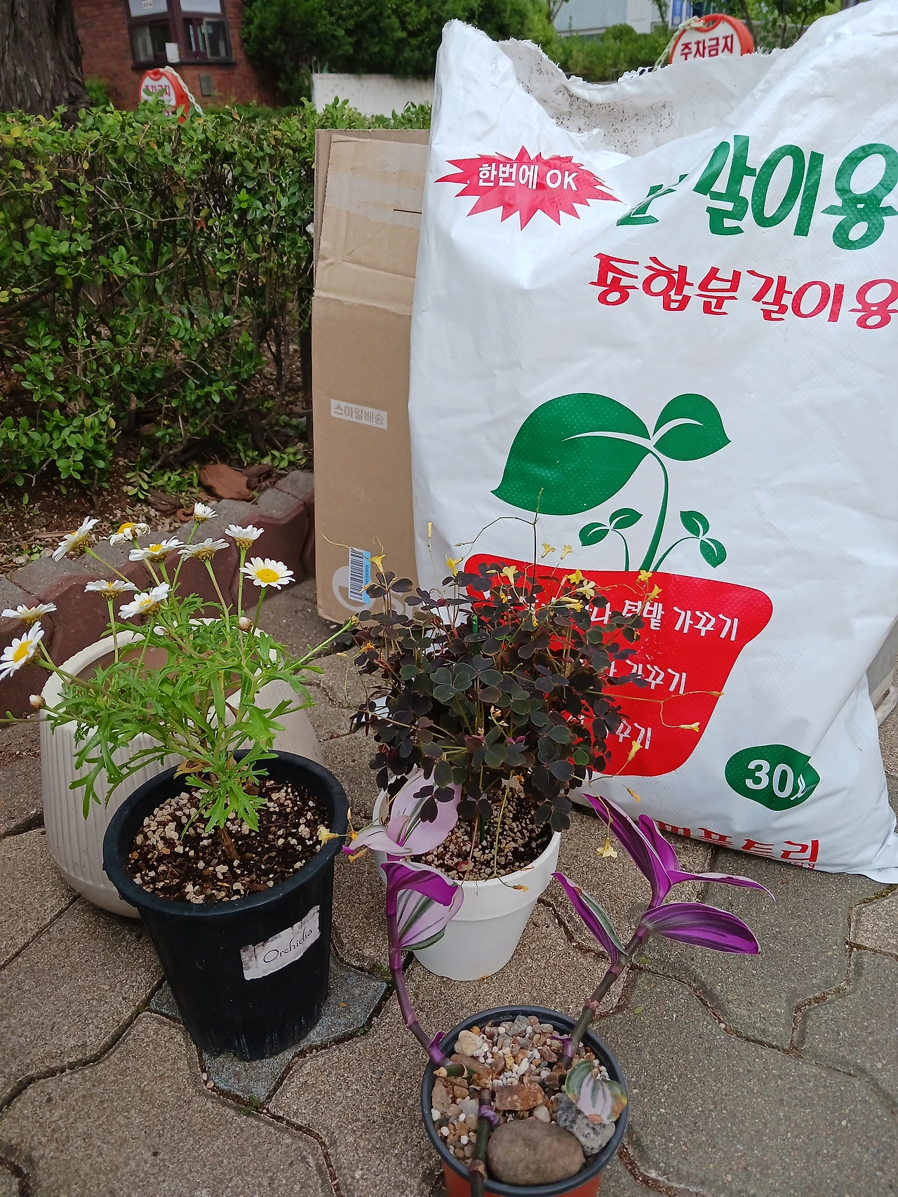 분갈이용 흙을 당근에서 사고, 화분은 아파트 화단에 버려진 걸 재활용해서 분갈이~ 꽃 위주로 역시 당근에서 샀고 집에서 관리해 별 문제가 없다고 생각했더니 의외로 화분이 플라스틱에, 토심이 얇다보니 빨리 토양이 건조해져 시드는 경향이 있어 토심을 깊게하기 위해 분갈이 시도~