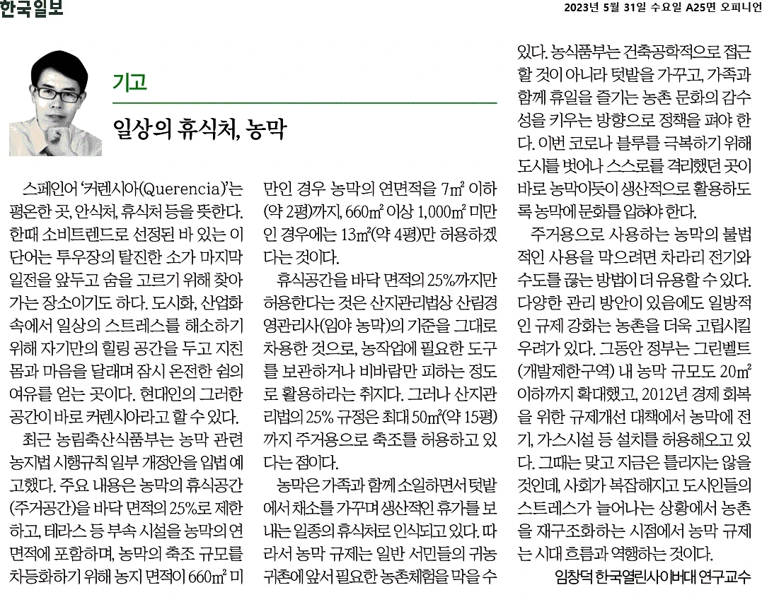 최근 정부가 농막(農幕)에서 숙박을 금지하고, 휴식공간을 제한하기로 한 것은 시대 흐름을 거스르는 조치다. 농막은 주말에 도시에서 벗어나 가족과 함께 자연 속에서 지내면서 텃밭에서 채소도 가꾸며 생산적인 휴가를 보내는 일종의 휴식처로 인식되고 있다. 농막을 별장처럼 개조하는 것은 규제할 필요가 있지만, 서민들의 주말 휴식처 역할을 하는 농막을 규제하는 것은 농촌 생활을 꿈꾸는 사람들이 귀농·귀촌에 앞서 필요한 농촌 체험을 하는 것은 막을 수 있다. 요즘 주중은 도시에서, 주말 이틀은 농막에서 지내는 ‘5도2촌’ 생활을 하는 사람이 늘고 있다. 농막은 도시인들이 농촌 문화의 감수성을 키우는 방향으로 정책을 펴야 한다. 다양한 방식으로 농촌 지역과 관계를 맺고 교류하는 ‘생활인구’를 늘리는 데도 도움이 될 것이다. 농막이 농촌을 활성화하는 교두보이자 도시인들이 농촌과 교류하는 매개체가 되도록 생산적인 활용 방안을 검토해야 한다.