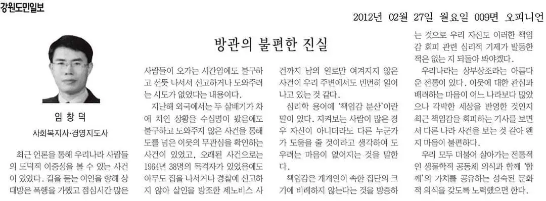 심리학 용어에 ‘책임감 분산’이란 말이 있다. 지켜보는 사람이 많은 경우 자신이 아니더라도 다른 누군가가 도움을 줄 것이라고 생각하여 도우려는 마음이 없어지는 것을 말한다.