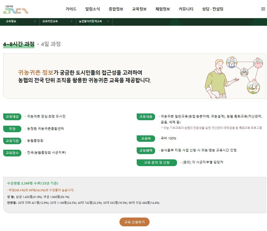 농업일자리 탐색교육(4시간~8시간, 4일 과정)이 있다. 4시간~8시간 교육은 귀농귀촌 희망자의 지역 접근성 및 편의성을 고려하여 농협의 전국단위 조직을 활용한 귀농귀촌 교육으로, 귀농귀촌 이해, 자산관리, 정책자금 등으로 구성돼 있다. 4일 과정은 농업분야 취·창업 희망자를 대상으로 일자리를 연계한 농업 체험과 현장실습 교육을 제공하며, 교육 구성은 농촌 일자리 탐색 등 이론교육(3일)과 현장탐색(1일)이다. 다섯째, 농업일자리 체험교육은 이론교육(5일), 농작업 실습교육(5일) 등 총 80시간으로 진행된다. 여섯 번째, 지자체 귀농귀촌교육은 지자체의 농업기술센터에서 실시하는 교육이다. 기타 자세한 교육 내용과 교육 기관은 그린대로 홈페이지에서 확인할 수 있다.