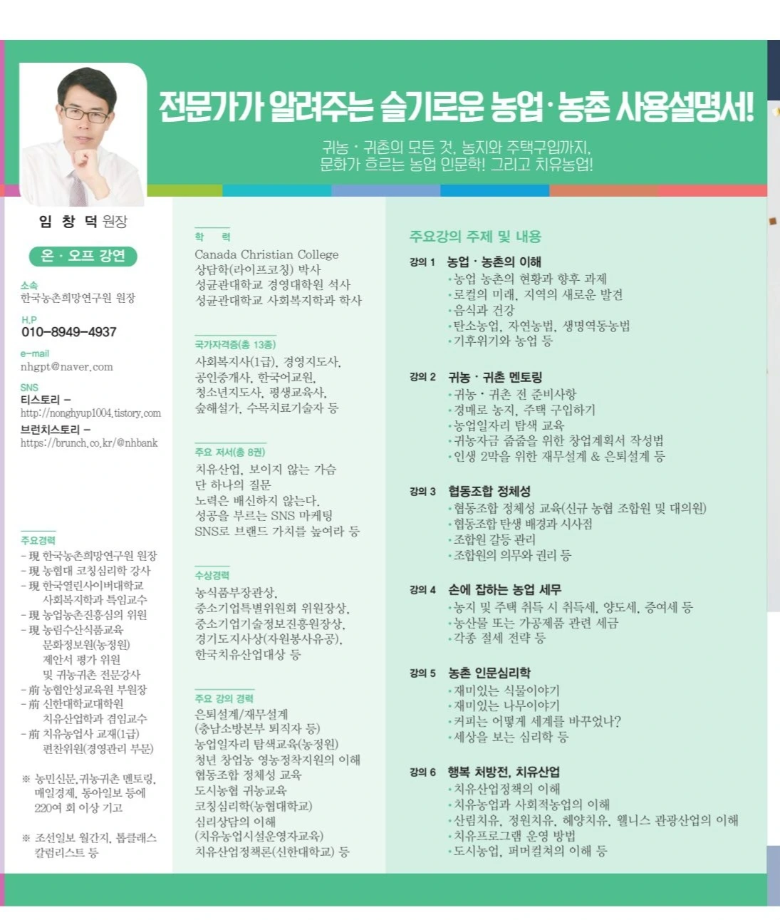경영학개론/조직심리학/심리학개론/마케팅원론/ 소비자행동론/귀농귀촌의 이해/농업법률/실전 농지 & 농가 구입 실패 사례/ 로컬푸드와 생명으로 돌아가기/숲치유/산림치유/ 농촌관광/MZ세대 슬기로운 직장생활/은퇴 후 자아 통합감 찾기/퍼스널 브랜딩/브랜드 정체성과 조직시민행동/협동조합 이해와 정체성/사회적 경제의 이해/청소년 진로탐색/앱을 활용한 스마트 워킹/SNS 홍보 마케팅/바로 써먹는 심리학/ 노인심리상담의 이해/부동산 재테크(실천)/부동산 공경매/ 농업세무/재무설계/공무원 및 일반인 은퇴설계/써드 에이지 노후 준비/재미있는 나무 이야기/숲해설 기법/화가 고흐 인문학/식탁위의 인문학/음식과건강/숲해설 방법 등