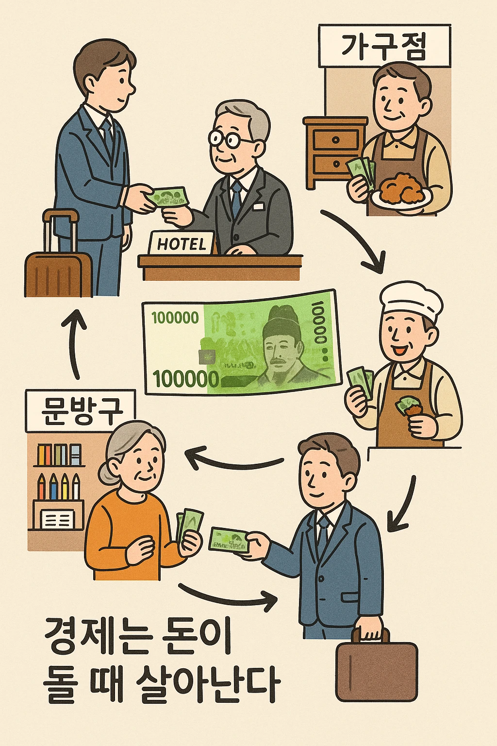 "한여행객이 호텔에 10만 원 예약금을 맡기고, 호텔 주인은 그 10만원으로 가구점 외상값을 갚습니다. 가구점 주인은 10만원으로 치킨집에서 치킨을 사고, 치킨집 주인은 그 10만원으로 문방구에서 물품을 구매, 문방구 주인은 다시 호텔에 빚을 깊고, 그러다 여행객은 예약을 취소하고 10만 원을 환불받아 떠납니다.
