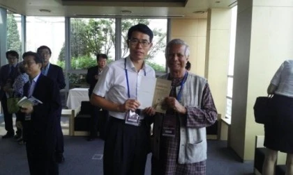 무하마드유누스, 노벨평화상 수상자와함께... 저 때는 한국에 행사 연사롤 참석했을 때, 교수 타이틀이로 직접 응대했다. 방글라데시의 은행가·대학교수. 방글라데시 빈민들에게 무담보 소액대출 운동을 전개하여 빈곤퇴치에 앞장섰다. 자신이 설립한 그라민은행과 함께 2006년 노벨평화상을 공동으로 수상하였다.
