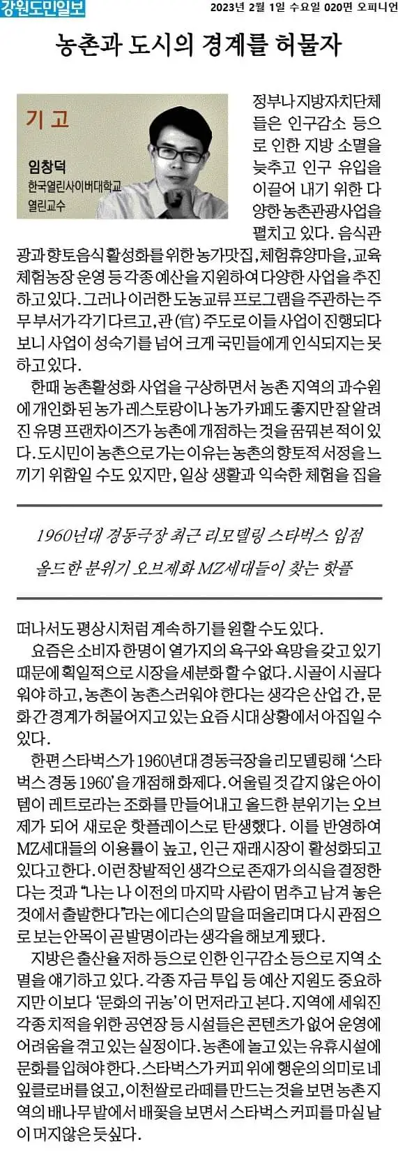 한편 최근 스타벅스가 1960년대 경동극장을 리모델링해 ‘스타벅스 경동 1960’을 개점해 화제다. 어울릴 것 같지 않은 아이템이 레트로라는 조화를 만들어내고 숙성된 시간을 품은 건물이 오브제가 되어 새로운 핫플로 탄생했다. 이것은 신구(新舊)의 경계를 허물어진 사례라 할 수 있다. 개점 결과 MZ 세대들의 이용률이 높고, 인근 재래시장이 활성화되고 있다고 한다. 스타벅스는 커피 위에 행운의 의미로 네잎클로버를 얹고, 이천 쌀로 라떼를 만드는 등 창의적인 시도를 하는걸 보면 농촌 지역의 배나무 밭에 스타벅스가 개점할 날이 멀지 않은 것 같다. 이런 창발적인 생각이 존재가 의식을 결정하게 한다. 에디슨이 말한 이전의 개발은 마지막 사람이 남겨 놓은 것에서 출발한다는 말처럼 기존의 것에 아이디어 하나면 새로운 문화가 될 수 있음을 보여줬다.