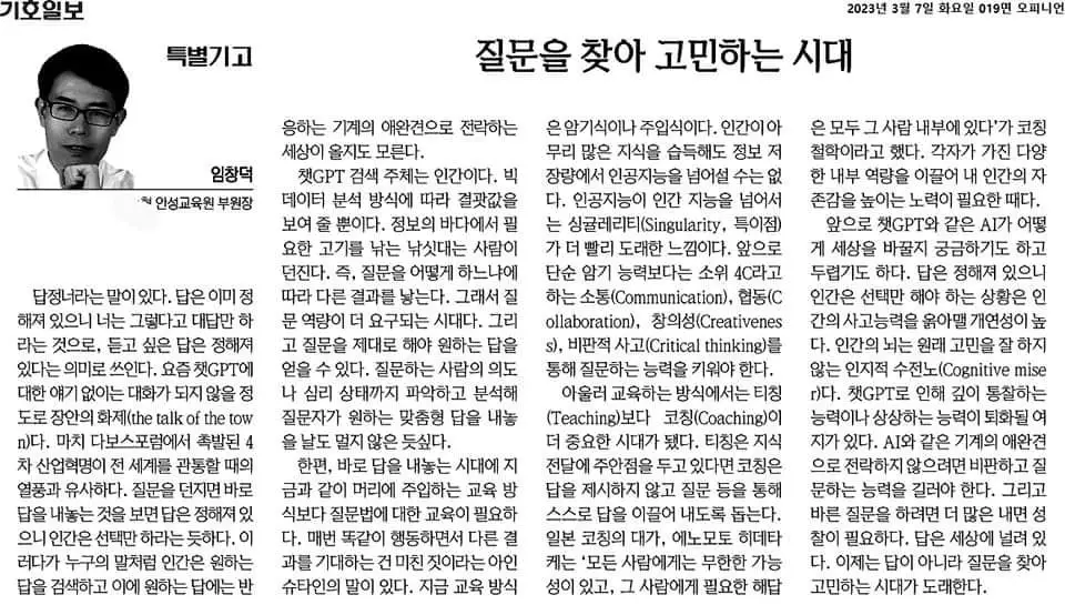 한편 바로 답을 내놓는 시대에 지금과 같이 머리에 주입하는 교육 방식 보다 질문법에 대한 교육이 필요하다. 매번 똑같이 행동하면서 다른 결과를 기대하는 것은 미친 짓이라는 아인슈타인의 말이 있다. 지금 교육방식은 암기식이나 주입식이다. 인간이 아무리 많은 지식을 습득해도 정보 저장량에서 인공지능을 넘어설 수는 없다. 인공 지능이 인간 지능을 넘어서는 싱귤레리티(Singularity, 특이점)가 더 빨리 도래한 느낌이다. 앞으로 단순 암기 능력보다는 소위 4C라고 하는 소통(Communication), 협동(Collaboration), 창의성(Creativeness), 비판적 사고(Critical thinking)를 통해 질문하는 능력을 키워야 한다.