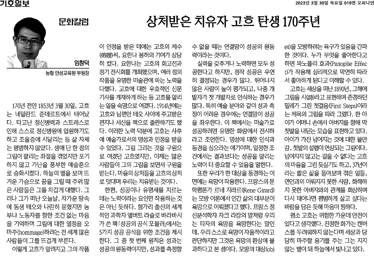 170년 전인 1853년 3월 30일, 고흐는 네덜란드 준데르트에서 태어났다. 타고난 정신병력과 스트레스로 인해 스스로 정신병원에 입원하기도 하고, 조울증에 시달리는 등 삶 자체는 평범하지 않았다. 생애 단 한 점의 그림이 팔리는 좌절을 겪었지만, 포기하지 않고 가난을 풍부한 예술혼으로 승화시켰다. 하늘의 별을 보며 뜨거운 가슴으로 꿈을 그릴 때, 주위 많은 사람들은 그를 차갑게 대했다. 그러나 그가 떠난 오늘날, 차가운 땅속에 동생, 테오와 나란히 묻혀있지만 농부나 노동자를 향한 조건 없는 마음을 기억하며, 그림에 대한 열정을 오마주(hommage)하려는 전 세계 많은 사람들이 그에서 영혼의 허기를 채우고 있다.
