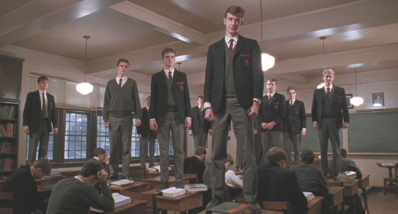 앞서 말한 공동체의 견고함을 자신들의 자부심으로 여기며 당당히 내세우던 곳이 있었다. 영화 '죽은 시인의 사회'에서의 '윌튼 아카데미'가 그러했다. 그들은 '전통, 명예, 규율, 탁월(tradition, honor, discipline and excellence)'을 아카데미의 표어로 내세우며 미국의 명문 대학들을 일컬으는 '아이비리그'에 학생들을 진학시키는 것을 학교의 궁극적인 목표로 여긴다. 그곳 학생들은 스터디 클럽이 오랜만에 모인 기념식이고, 방학 때의 예습은 자랑거리인 말 그대로 '모범생'인 모습이었다. 그러한 학교에 문장 하나를 갖고 새로운 시각을 열어준 선생님이 한 분 오셨다.
