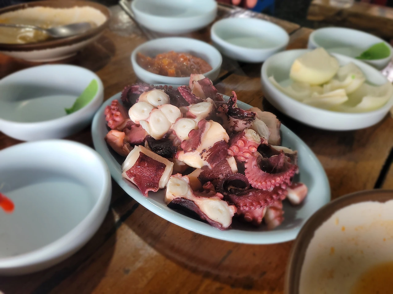 사흘 차엔 설렁설렁. 평소 식당을 맘에 담지 않는 내가 그나마 제주에서 가장 좋다고 꼽는 곳, 동복리해녀잠수촌. 전복죽, 회국수, 해물라면 등이 만원이라 다른 해녀의집보다는 저렴한 편이다. 라면에 든 문어가 포실하니 맛있어서, 따로 반만 삶아 달라 청하니 그 역시 만원에 흔쾌히 들어주신다. 이곳의 맹점은 제주막을 팔지 않는다는 것인데, 외부에서 사 들고 가는 것을 허락하시기에 오히려 장점이 될 수도 있다(술값이 싸게 먹히니까). 내가 좋아하는 곳을 동행들이 좋아하니 기쁘다. 날이 풀리면 해질녘 야외에서 꼭 한 잔 하시길. 노을의 속도로 취할 것이외다.
