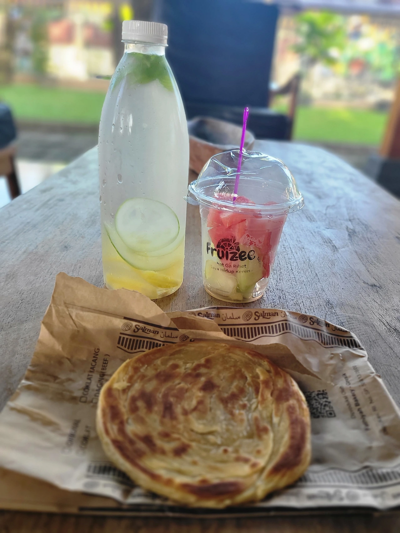 어제는 광장에서 아침으로 부부르아얌(bubur ayam ; 닭죽)을 사먹었고, 오늘은 즉석에서 구워주는 아랍 식 빵과 조각과일, 과일이 반신욕 하고 간 듯 맛이 희미한 물 한 병을 사서 숙소로 돌아왔다. 대학교 프로그램의 일환으로 새벽 6시부터 9시까지 과일을 판다는 여대생들에게 친구들과 다시 올 것을 약속했으나, 과일 맛이 그닥이라 약속을 지킬 수 있을지 모르겠다. 그 미소가 눈에 아른거려 혼자라도 다시 가야지.