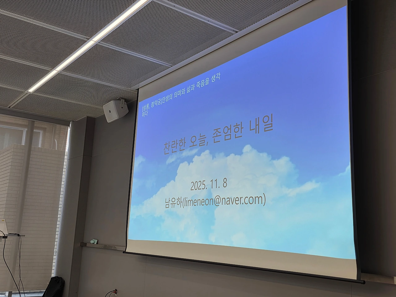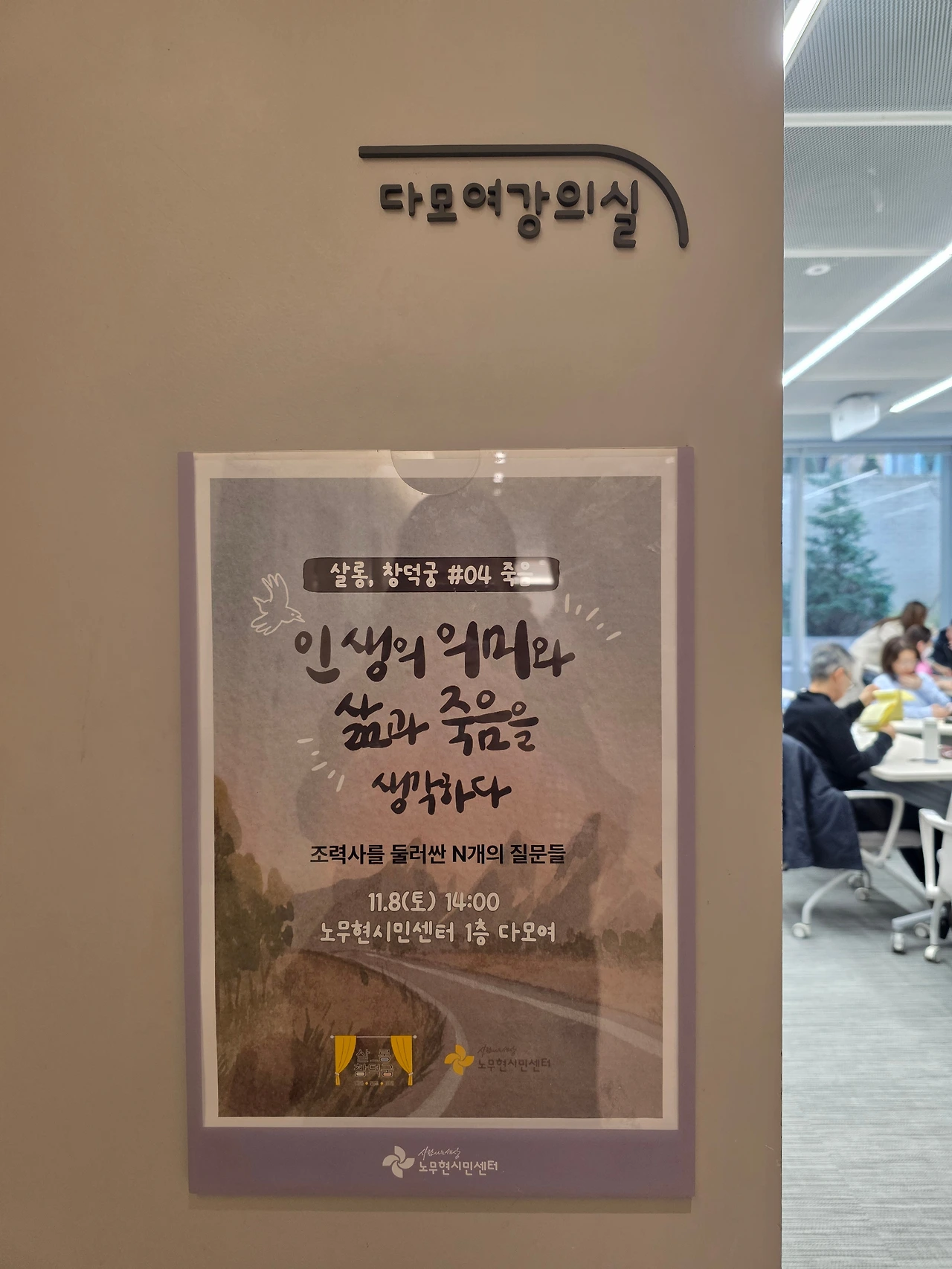 한 시간의 강의 후 조별로 나름의 토론 시간이 주어졌다. 강의를 신청한 각자의 이유를 저절로 알게 됐다. 다들 비슷한 마음이었다. 그리고 웰다잉에 대해서도 이야기 나누었다. 내 의지로 내 몸을 둔하게나마 움직일 수 있을 때까지만 살고 싶다고, 죽음이 늘 가까이 있다고 생각해 아이들과도 너무 무겁지 않게 나의 죽음에 관해 말을 건넨다고, 장례식장에서 틀어줬으면 하는 노래를 정해 친구들에게 일러두었다고 얘기했다.