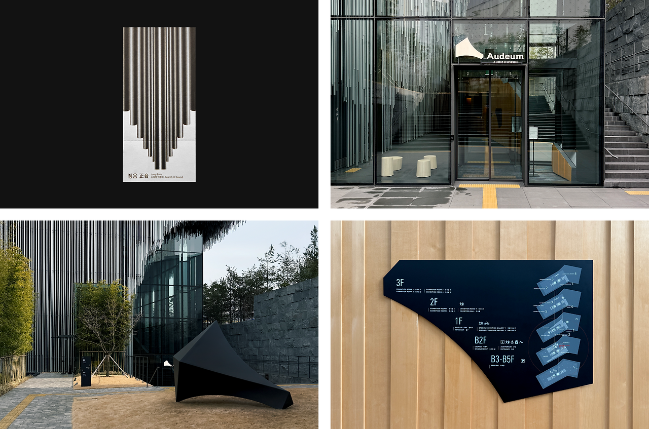 오디움 박물관에서 단순한 심볼 표현을 통해 브랜드 아이덴티티의 확장성을 효과적으로 적용된 부분을 발견할 수 있었습니다. 박물관 정문의 조형물을 비롯해 사이니지, 심볼에 애니메이션 효과가 들어가 소리 움직임을 전달하는 웹사이트, 평면 인쇄물, 굿즈 등 다양한 매체에 동일한 시각 요소를 반복적으로 사용함으로써,