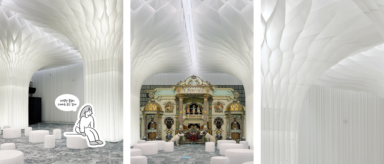 하얀 천으로 뒤덮인 공간에서 음악을 감상하면서 이 공간은 마치 꿈에서 본듯하거나, 눈을 감았다가 떴을 때 잠시 하얗게 펼쳐지는 장면이 연상되었습니다. 부드러운 패브릭으로 만들어진 공간 덕분인지 마치 모든 감각을 쏟아낸 후, 차분히 가라앉히며 마음의 평온을 되찾게 해주는 듯한 느낌을 받을 수 있었습니다.