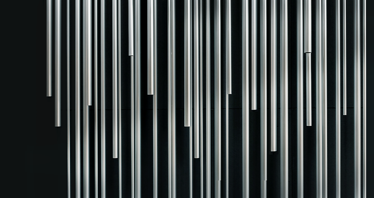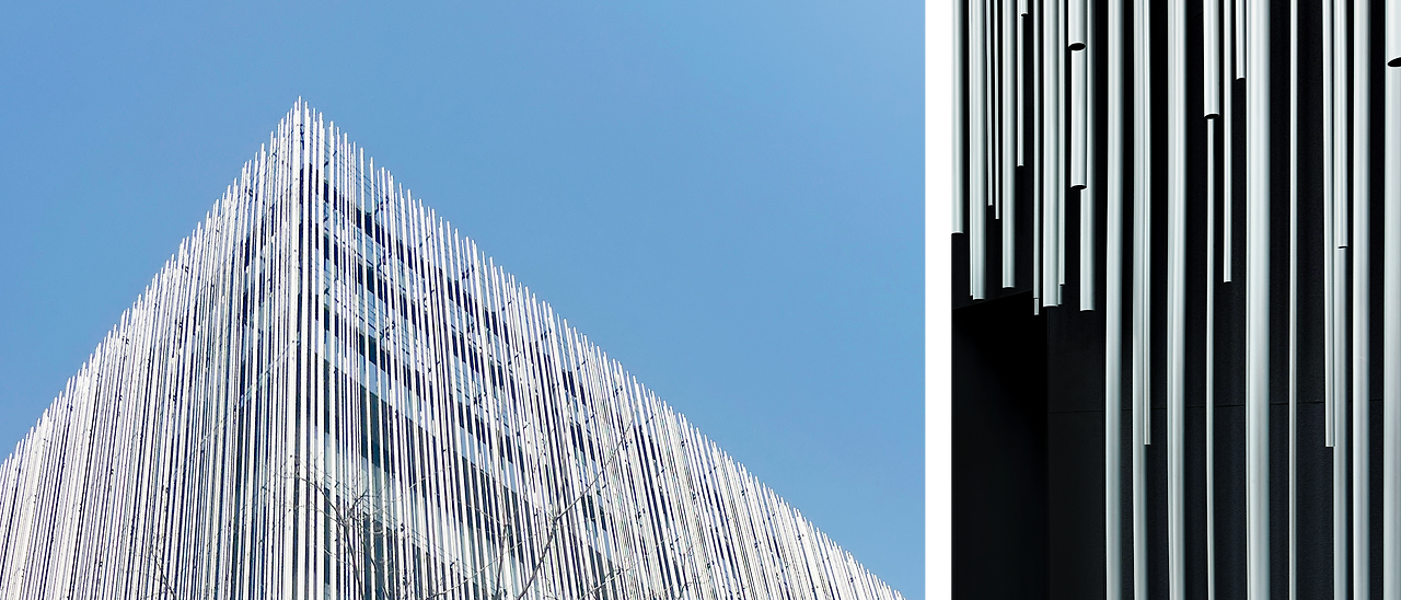 건축의 외관이 알루미늄이라는 강한 마감재를 무질서하게 배치해 알루미늄 파이프들이 빛을 받아 반사되어