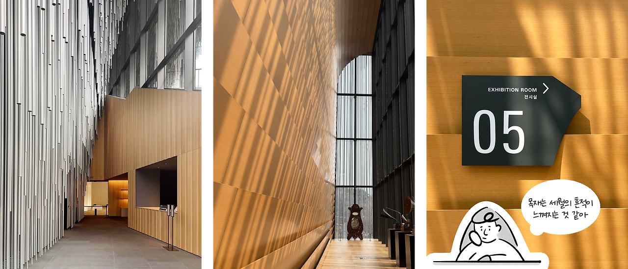 거대한 외관을 지나 입구에 들어서면, 편백 향기가 관람객을 맞이합니다. 이어 내부는 외벽을 따라 목재로 채워진 공간으로 이어져 있었습니다. 이는 외부의 차갑고 단단한 알루미늄과 대비를 이루며, 목재 특유의 따뜻하고 편안한 느낌을 받을 수 있었습니다. 이러한 흐름에 따라 박물관 내부는 안정감 있는 공간으로 자연스레 전환되며 내부 곳곳에 유리창을 통해 비추는 자연광으로 인해 내부와 외부가 경계 없이 연결되어 마치 자연과 공간이 하나로 이어지는 듯한 인상을 받았습니다.