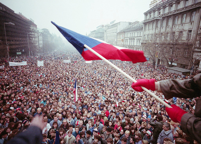 40여 년 동안 지탱해 온 공산주의가 무너지기 시작합니다. 사회주의 통제의 실패는 경제적 파탄을 일으켰고, 자유와 인권을 짓밟는 공산주의 체제에 대한 젊은 세대들의 불만과 불신이 고조되어 갑니다. 1985년, 소련 고르바초프의 개혁과 개방 정책이 동유럽 혁명으로 이어지면서 체코-슬로바키아에서도 본격적인 혁명의 기운이 감돌게 됩니다. 이리하여 1989년 12월, 반체제 활동을 주도해 온 하벨이 대통령으로 선출됨으로써 40년간 지속되어 온 공산정권은 무너지고, 체코-슬로바키아는 새로운 전기를 맞이하게 됩니다. 그 과정을 '벨벳 혁명'이라고 합니다. 벨벳은 굉장히 부드러운 천 재질을 말하는데, 큰 유혈 충돌 없이 부드럽게 혁명이 진행되었다 해서 '벨벳 혁명' 또는 '신사 혁명'이라 불리게 된 거죠.'벨벳 혁명' 당시 70만 명의 체코-슬로바키아 국민들이 운집하여 체코의 민주화를 열망했던 장소가 바로 바츨라프 광장 이기도 합니다. 지금 프라하의 인구가 약 100만 명입니다. 70만 명이 바츨라프 광장에 모였다고 생각한다면 어마어마한 수의 사람들이 모였다고 볼 수 있습니다.