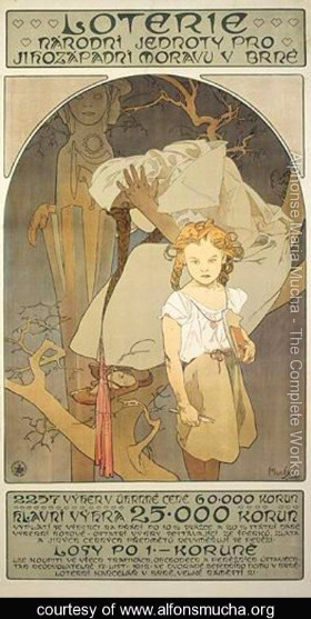 무하는 민족을 위한 포스터도 제작합니다. <브르노 남서 모라비아를 위한 국민연합 복권>이라는 작품입니다. 단지 복권을 광고하기 위한 포스터라고 보기에는 너무나도 심오합니다. 무슨 내용을 담은 포스터일까요? LOTERIE, '복권'이라는 글 아래에 절망에 빠진 한 여성의 모습과 펜과 공책을 들고 정면을 응시하고 있는 한 여자아이의 모습을 볼 수 있습니다. 여자는 목상(슬라브 고대 신, 스반토비토)을 감싸며 생각합니다. " 정녕 신도 우리를 지켜주지 못하는 것인가." 그리고 펜과 공책을 든 아이는 이렇게 말하고 있습니다. "공부하고 싶어요. 도와주세요..." 그렇습니다. 이 작품은 슬라브 민족의 정체성과 언어를 지키기 위해 자금지원을 호소하는 내용입니다. 오스트리아-헝가리 제국에 지배를 받을 당시 학교에서는 독일어 교육이 이루어졌고, 체코의 말과 글을 가르치는 학교가 점차 사라지기 시작합니다. 그래서 민족성(언어)을 지키기 위한 교육을 위해 사설학교 설립이 필요했고 이를 위한 자금 마련을 위해 복권을 발행했던 것입니다.