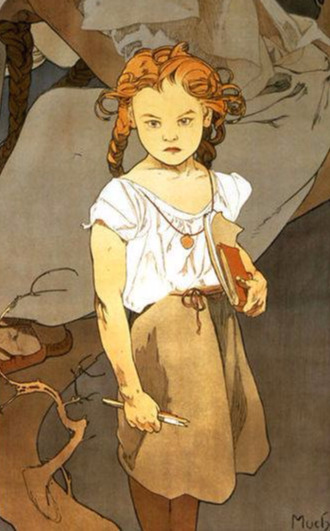 자신의 결심을 과감하게 실행할 수 있었던 배경에는 아내 '마르슈카'의 역할도 컸습니다. 그녀는 무하에게 안정을 찾아주었죠. 21살이었던 그녀는 미술학도로서 프랑스에 있었습니다. 그곳에서 같은 고국 출신인 무하의 성공을 지켜보았던 그녀는 예술가로서 그를 존경하게 되었고, 같은 민족이었기에 무하도 스스럼없이 그녀와 교류하게 됩니다. 먼저 사랑의 감정을 느낀 건 44세의 무하였습니다. 점점 그녀에게 빠져들던 그는 '마르슈카'라는 애칭으로 부르며 지속적으로 편지를 주고받습니다. 결국 1906년 6월 마르슈카와 프라하에서 결혼에 골인, 후에 가족은 알폰스 무하의 활동에 많은 영향을 끼칩니다.