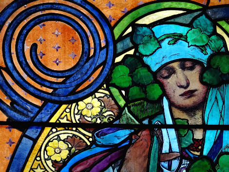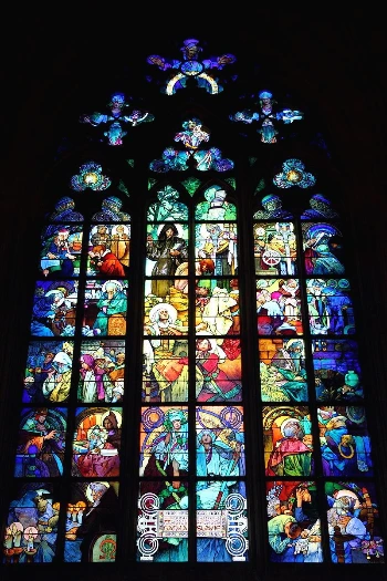 1931년 무하는 프라하성 내에 자리한 성 비투스 대성당의 스테인드 글라스 제작에도 참여합니다. 이 성당은 926년경 작은 원형의 로툰다 교회 건물이었던 것을 11세기에 로마네스크 양식으로 새로 지어졌습니다. 1344년 까를 4세에 의해 고딕 양식으로 재건축되었지만 잦은 전쟁과 화재로 완성되지 못한 채 방치되어 있었습니다. 20세기 초가 되어서야 많은 경제적인 후원을 받으며 건축에 들어갑니다. 그때 체코의 슬라비아계 은행으로부터 자금 지원을 받은 무하가 이 스테인드 글라스를 만들게 됩니다. 그리고 그는 세상 어디에서도 볼 수 없는 특별한 스테인드 글라스를 만들어 냈습니다.
