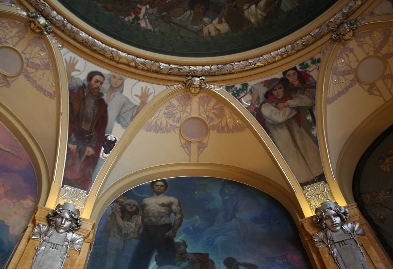 1910년, 지원에 힘입어 <슬라브 서사시>의 작업을 위해 고국으로 돌아옵니다. 하지만 무하는 단지 <슬라브 서사시>만을 제작했던 것은 아닙니다. 그는 먼저 프라하 시민회관(Obecní Dům)과 내부의 시장 홀(Lord Mayor's Hall) 작업을 시작합니다. 민족의 자긍심을 높이기 위해 이곳에 체코 역사 속 훌륭한 인물들을 그려 넣습니다.