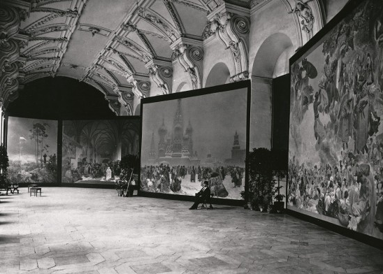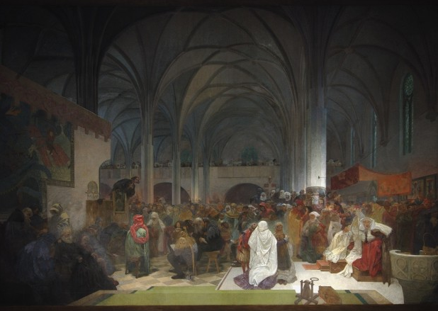 찰스 크레인의 지원으로 경제적인 문제를 해결한 무하로서는 어떠한 대가도 바라지 않고도 조국을 위해 자신의 모든 시간과 정열을 바칠 수 있었습니다. 무하는 슬라브 서사시를 하나하나 완성하기 시작합니다. 하지만 시련도 있었죠. 제1차 세계 대전의 발발은 무하의 작품 제작에 큰 영향을 끼칩니다. 이전과 같은 크기의 대형 캔버스를 구하기 어려웠졌습니다. 그래서 이때 완성된 작품들은 저마다 크기가 다르게 그려졌습니다. 하지만 전쟁의 시련의 끝은 조국의 독립이었습니다. 조국 독립의 기쁨과 함께 무하의 작업도 탄력이 붙습니다. 1919년 <슬라브 서사시> 가운데 11점을 프라하의 클레멘티놈(Klementinum) 홀에 전시하였고, 전시가 성공적으로 끝나자 그해 겨울 미국에서도 전시하게 됩니다. 남은 작품도 순조롭게 진행되며, 1923년 드디어 슬라브 서사시 20 연작 완성을 완성하게 됩니다. 꿈꾸던 인생의 후반기 목표를 이루게 된 것이지요.