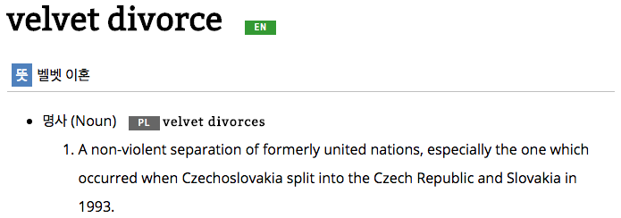1992년, 두 국가가 이혼에 합의합니다. 하나의 국가로 영원할 줄로 알았는데 말이지요. 모진 시간을 서로 의지하고 갈등의 시간을 보내기도 했으며 행복한 시간도 함께했습니다. 그렇게 80년이 조금 넘는 결혼생활을 청산하고 두 나라는 이혼합니다. 과정은 부드러웠습니다. 어떠한 유혈충돌도 없이 평화로운 합의에 의해 이루어졌습니다. 비폭력 혁명으로 공산정권을 무너뜨린 벨벳혁명과 같이 '부드러운 벨벳'처럼 두 국가가 분리했다 하여 이를 벨벳 이혼이라고 부릅니다. 1993년 1월 1일, 유럽의 지도에는 체코슬로바키아에서 체코공화국(Česká republika)과 슬로바키아공화국(Slovenská republika)으로 독립된 두 나라가 탄생합니다.