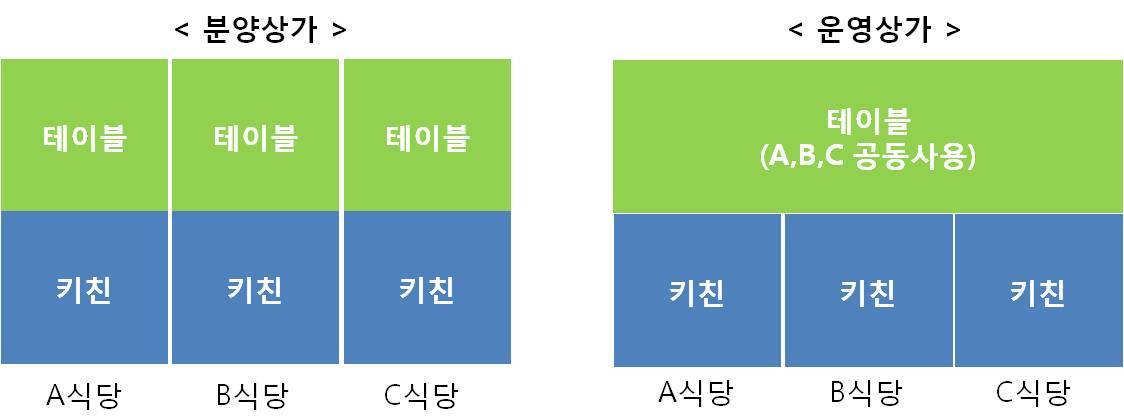 분양상가는 구획된 공간 내에서만 영업을 합니다. A식당의 손님이 넘치는 경우, 옆의 B식당에는 테이블 자리가 있더라도 이를 이용할 수가 없지요.