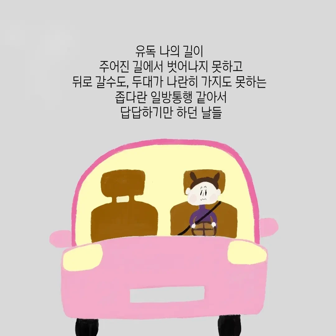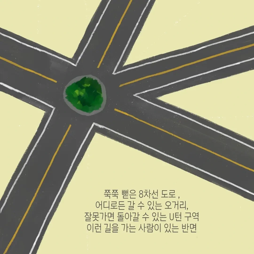 남들은 쭉쭉 뻗은 8차선 대로에 원하는 대로 방향을 바꿀 수 있는 교차로도 있고 잘못 가면 되돌아가는 유턴구역도 있는데 유독 내가 가는 길만 좁디좁은 일방통행 같았다.