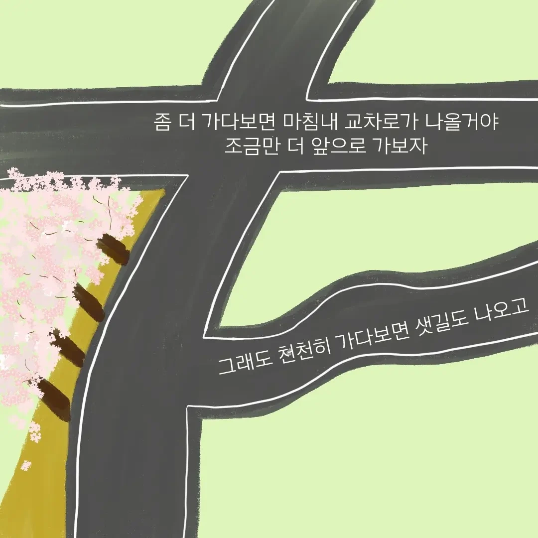 그러나 나만이 아니다. 누구나 내가 원하는 목적지까지 가기 위해선 좁고 울퉁불퉁한 길도 가야 하고, 두근대는 가슴을 부여잡고 비보호 신호도 건너야 하고, 내멋에 사는 운전자들도 잘 피해나가야 한다. 때로는 빵빵 뚫린 고속도로에서 최고 속력을 내면서 달릴 때도 있을 것이고, 때로는 교통사고가 나서 한동안 길에서 지체해야 할 때도 있을 것이다.