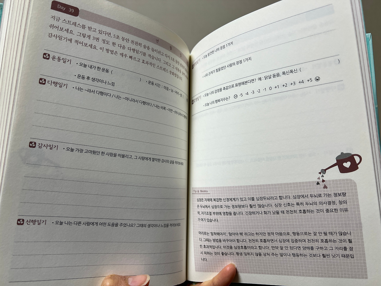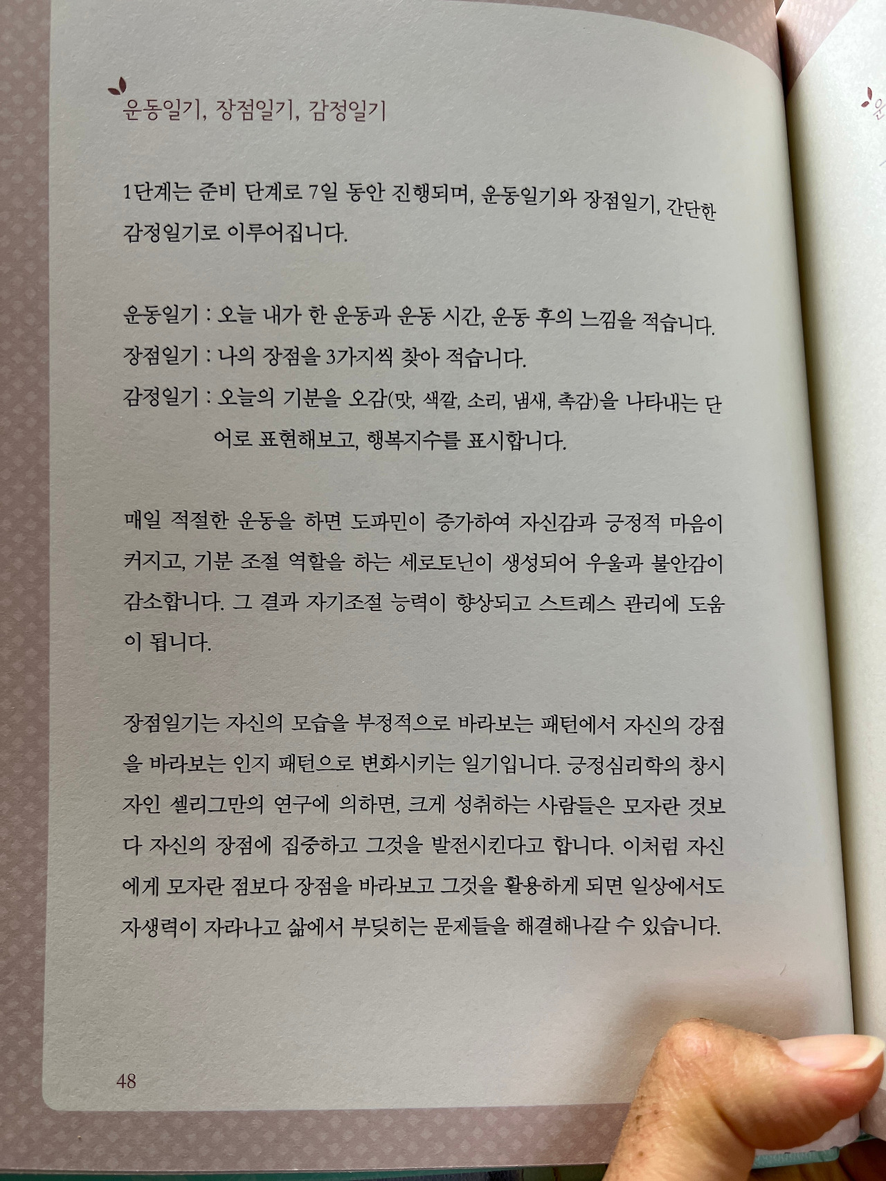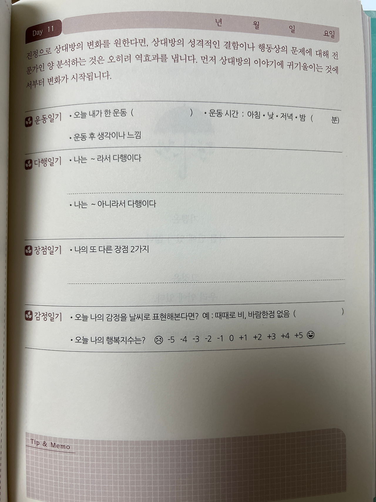 다음으로 도움이 된 책은 <최성애 박사와 함께하는 행복일기>였다. 초반에는 다른 책처럼 글이 나오고 뒤에는 행복일기를 따라 쓰도록 되어있다. 처음에는 짧게 쓰고 점점 길어진다. 뭘 써야 할지 막막할 때가 있는데 쓸 문장을 정해주니 그대로만 따랐으면 돼서 어려울 것은 없었다.