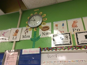 초등학교 교실답게 벽에는 시계 옆에 5 단위로 분을 볼 수 있는 숫자를 써놓았고요. (Counting by 5, 5씩 세어보기를 잘 할 수 있겠지요.)