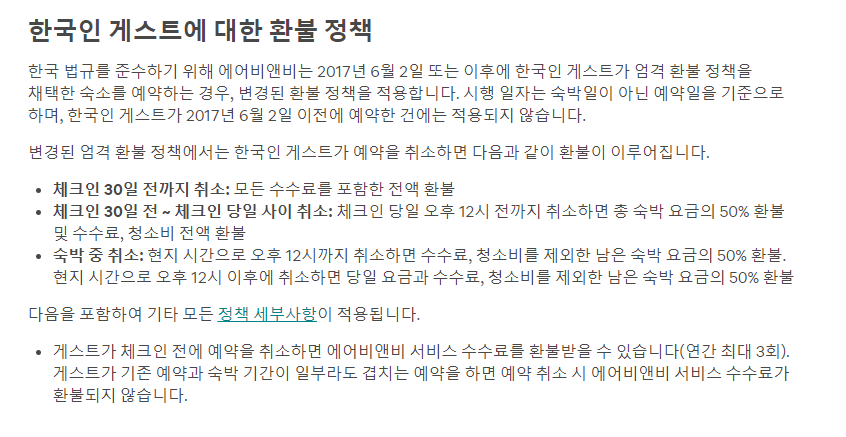 - 결제를 할 때 당황하는 경우가 보통 각종 수수료와 환불 조건을 접할 때인데요, 에어비앤비 플랫폼 수수료 명목의 서비스 수수료, 그리고 숙소마다 청소비가 별도로 붙는 조건도 있어서 Host 설명을 잘 확인해야 합니다. 환불조건도 유연, 보통, 엄격 3가지로 구분되어 있는데, 유연의 경우 숙박 24시간 전에 전액 환불, 보통의 경우 5일 전 취소까지 전액 환불, 엄격의 경우는 체크인 30일 전까지 예약을 취소하면 전액이 환불됩니다. 체크인까지 30일이 남지 않은 시점에 취소하면 총 숙박 요금의 50%와 수수료 전액이 환불됩니다. 인기 있는 숙소의 경우 환불 조건이 보통 엄격한 경우가 많아서 일정 취소 가능성을 잘 생각해서 결제할 필요가 있습니다.
