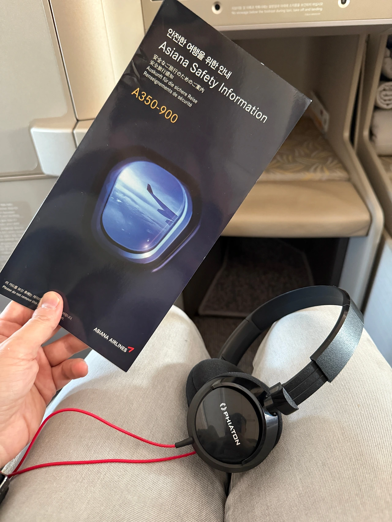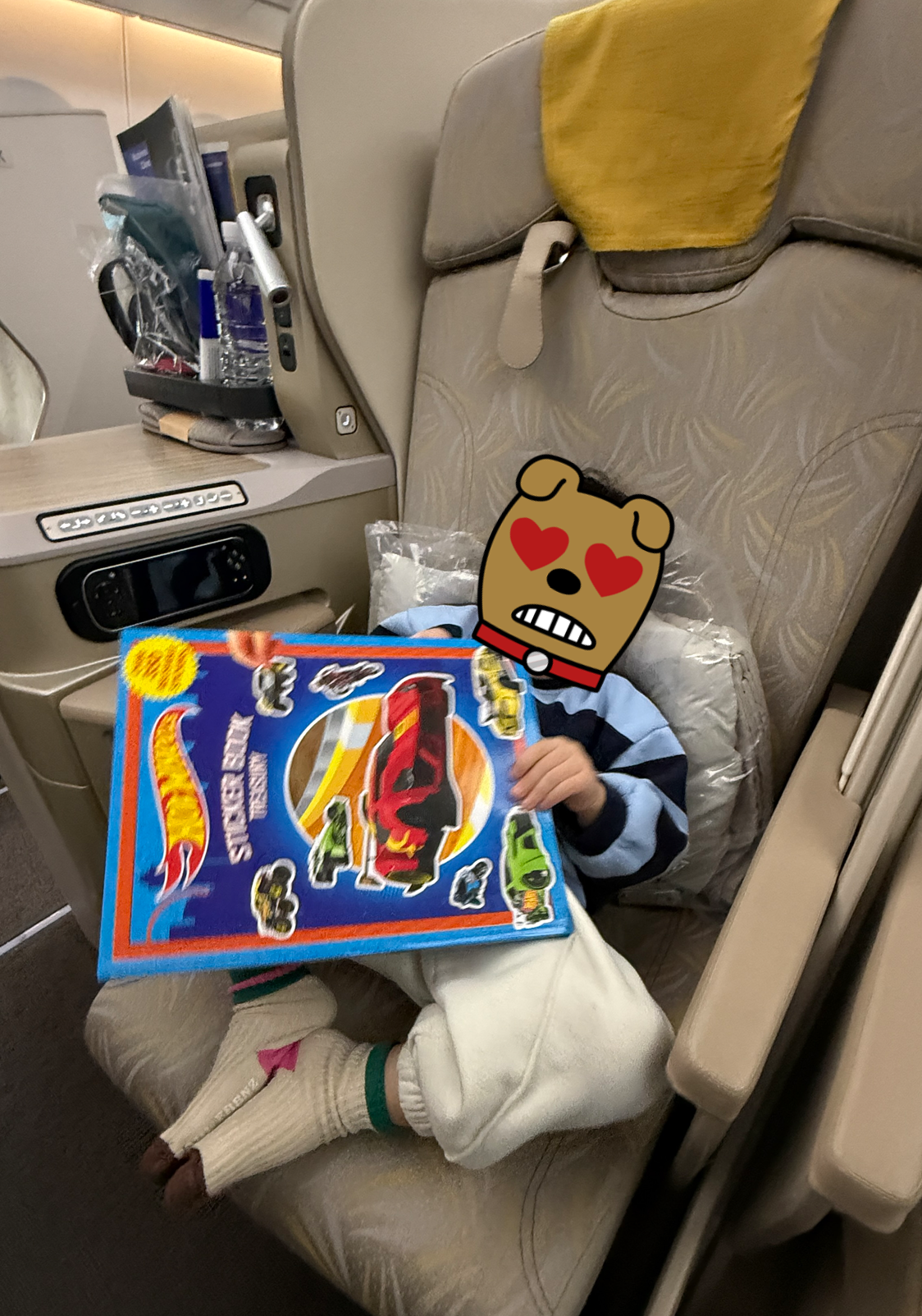 탑승해서 자리에 앉았습니당. 비즈니스 스마티움이고 아이 케어를 위해 중앙 붙어 있는 2자리를 사전 신청해서 앉았어요. 유아 치트키인 Hot Wheels 스티커북을 꺼내서 이륙 하기 전까지 열심히 시간 보내 봅니다.