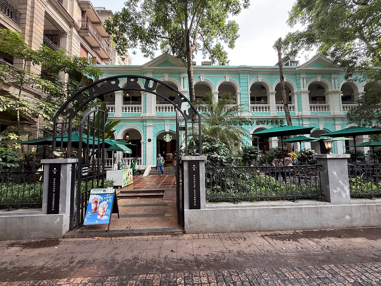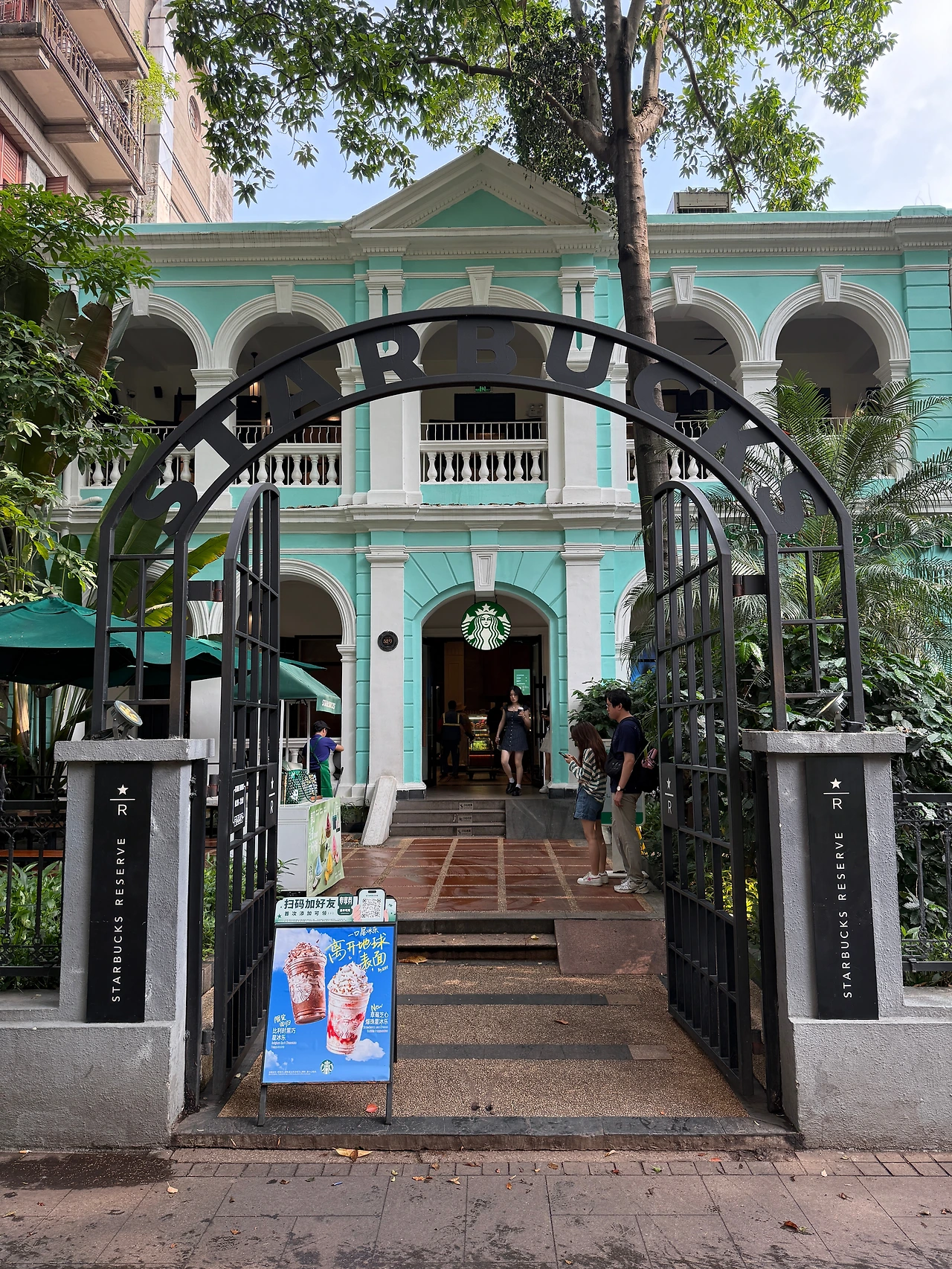 샤미앤다오의 스타벅스가 입주한 건물은 19세기 후반 영국 조계지 시절에 지어진 네오클래식 양식의 건물로, 과거에는 영국계 상업은행이나 무역회사 사무소로 사용되었을 가능성이 높다고 합니다. 정확한 연혁은 찾기 힘드네요. 샤미앤다오는 19세기 중반 제2차 아편전쟁 이후 영국과 프랑스에 의해 조계지로 설정되었으며, 전체 면적의 약 3/5이 영국, 2/5이 프랑스에 할당되었습니다. 이러한 역사적 배경으로 인해 섬 전체에 다양한 유럽식 건축물이 혼재되어 있어서 그걸 감안하고 보면 재밌는 곳입니다.
