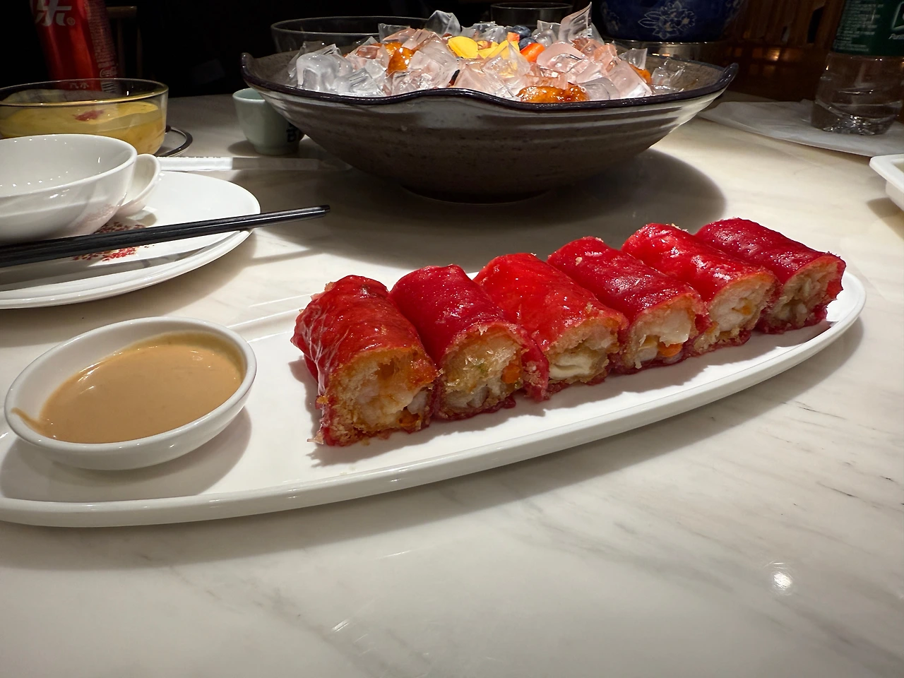 전날 점도덕에서 먹었던 창펀을 여기서도 먹어봅니다. 붉은 색의 찹쌀피 안에는 바삭하게 튀긴 유탸오(중국식 튀김빵)와 새우, 채소 등이 속재료로 들어 있어 식감과 풍미가 조화를 이룹니다. 옆에 곁들여진 땅콩소스에 찍어 먹으면 고소함이 더해져 더욱 맛있습니다. 딤섬의 전통을 현대적으로 재해석한 요리로, 시각적으로도 강렬해 많은 손님들의 사진 속 단골 메뉴죠 ㅎㅎ