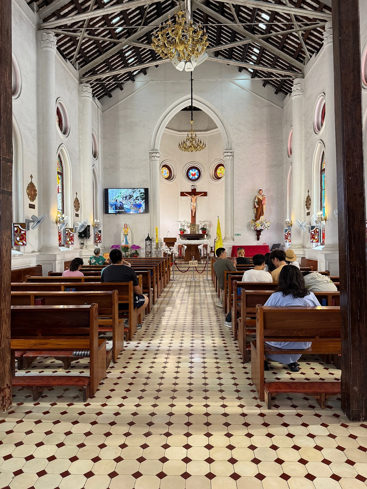 성당 내부는 소박하지만 정갈하게 꾸며져 있으며, 스테인드글라스를 통해 들어오는 빛이 따뜻하고 평화로운 분위기를 만들어줍니다. 이 성당은 일요일마다 미사가 열려 현지 신자들과 여행객 모두가 함께하는 종교 문화의 장이 되고 있습니다.