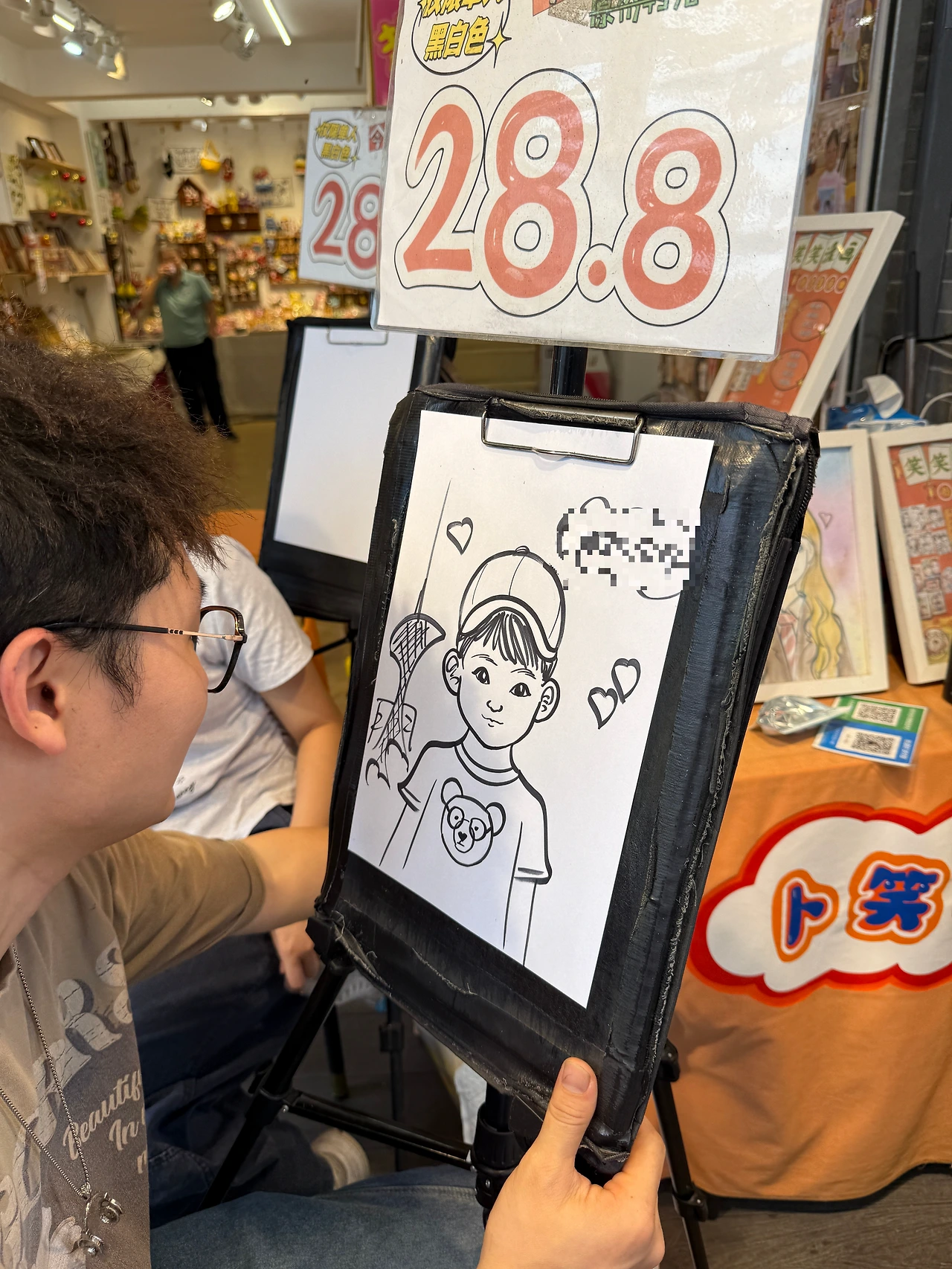 길 걷다가 스케치 잘 하시는 분 있길래 흑백 그림 부탁해 봅니다. 아이도 생각보다 고분고분 가만 앉아서 그림 그려주는 걸 기다립니다. 결과물도 맘에 들었어요 가격은 28위안 대략 5,500원.